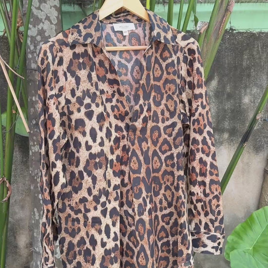 Pleated V-Neck Long Sleeve Shirt in a bold Leopard print, 100% linen organza — a clean, modern wardrobe essential cut from breathable linen that works for corporate settings, dinner engagements, or sophisticated weekend occasions. With an elegant pleat detail through the front and back yoke, it creates a refined, modest silhouette that feels polished without trying too hard.