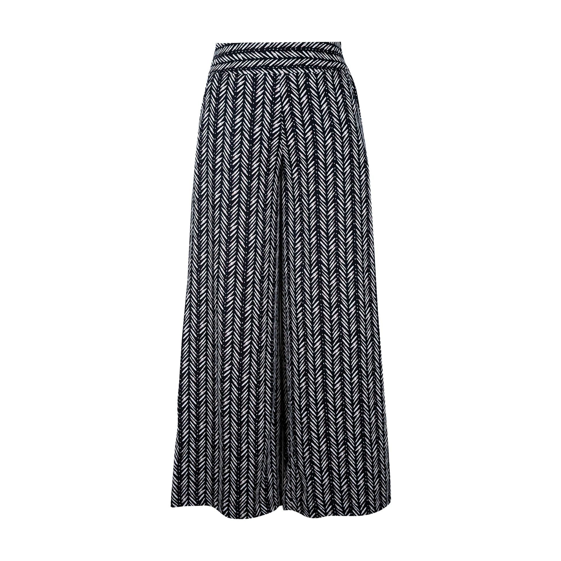 Our signature wide leg women's pants in a linen-cotton mix with white chevron painted lines printed on black, reminiscent of artisanal block printing. A sophisticated black-and-white palette ensures it remains versatile and pairs perfectly with a simple black or crisp white linen shirt.